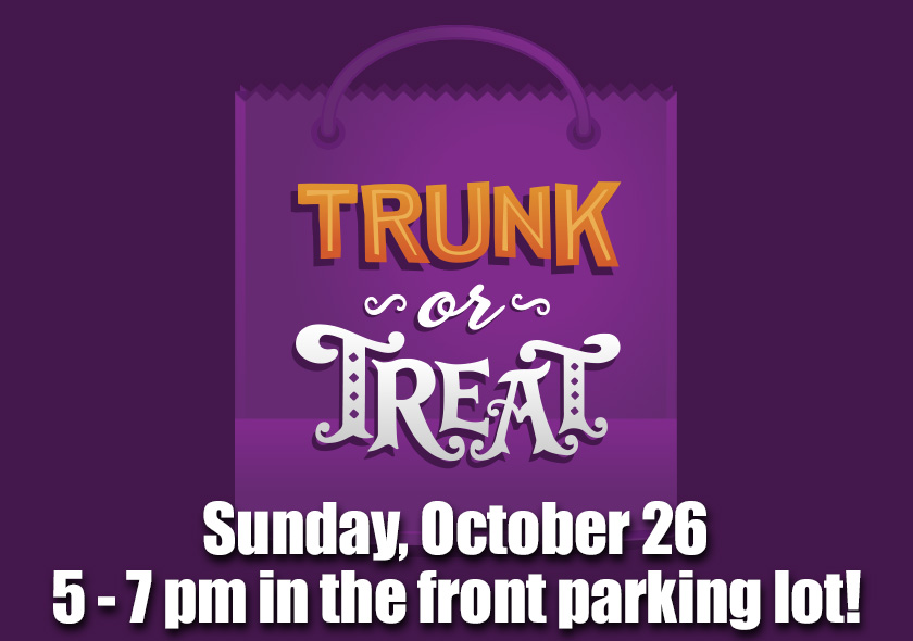 Join us on Sunday, October 26 for a night of candy, costumes and trunk-or-treating. Trunk-or-Treat will take place in our front parking lot.